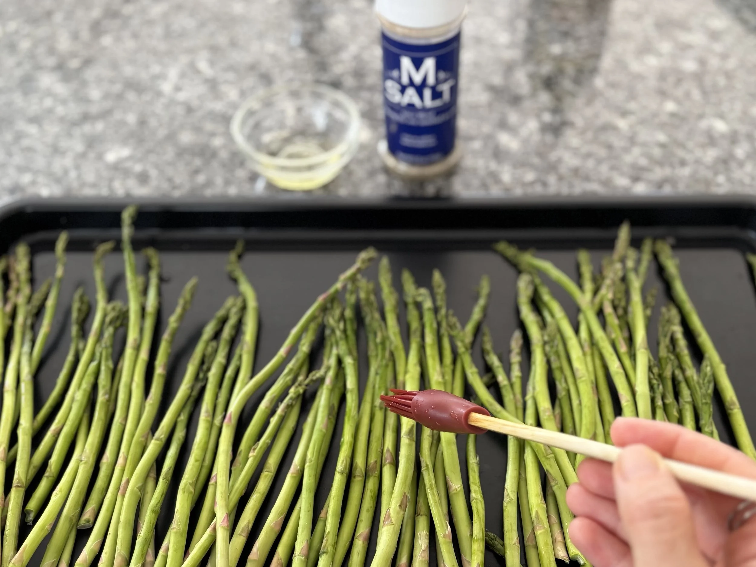 Wash asparagus and snap off the woody end. Place tender pieces in a single layer on a baking sheet and brush with oil. Lightly sprinkle spice blend over asparagus. Roast for 15-20 mins, rotating asparagus 1/2 way through to allow for even browning.