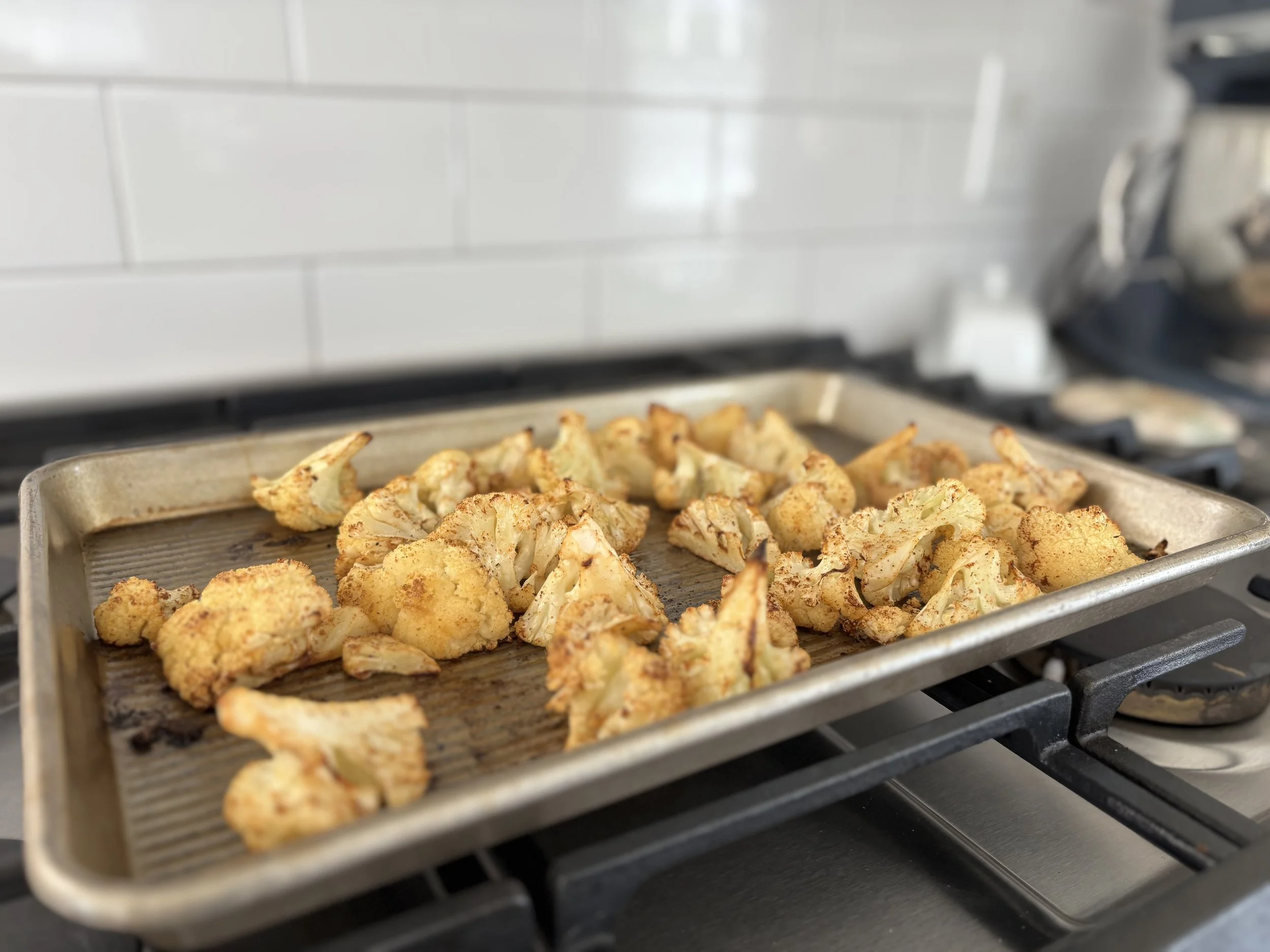 Place cauliflower in a single layer on baking sheet. Roast for 30 mins, rotating cauliflower 1/2 way through to allow for even browning.