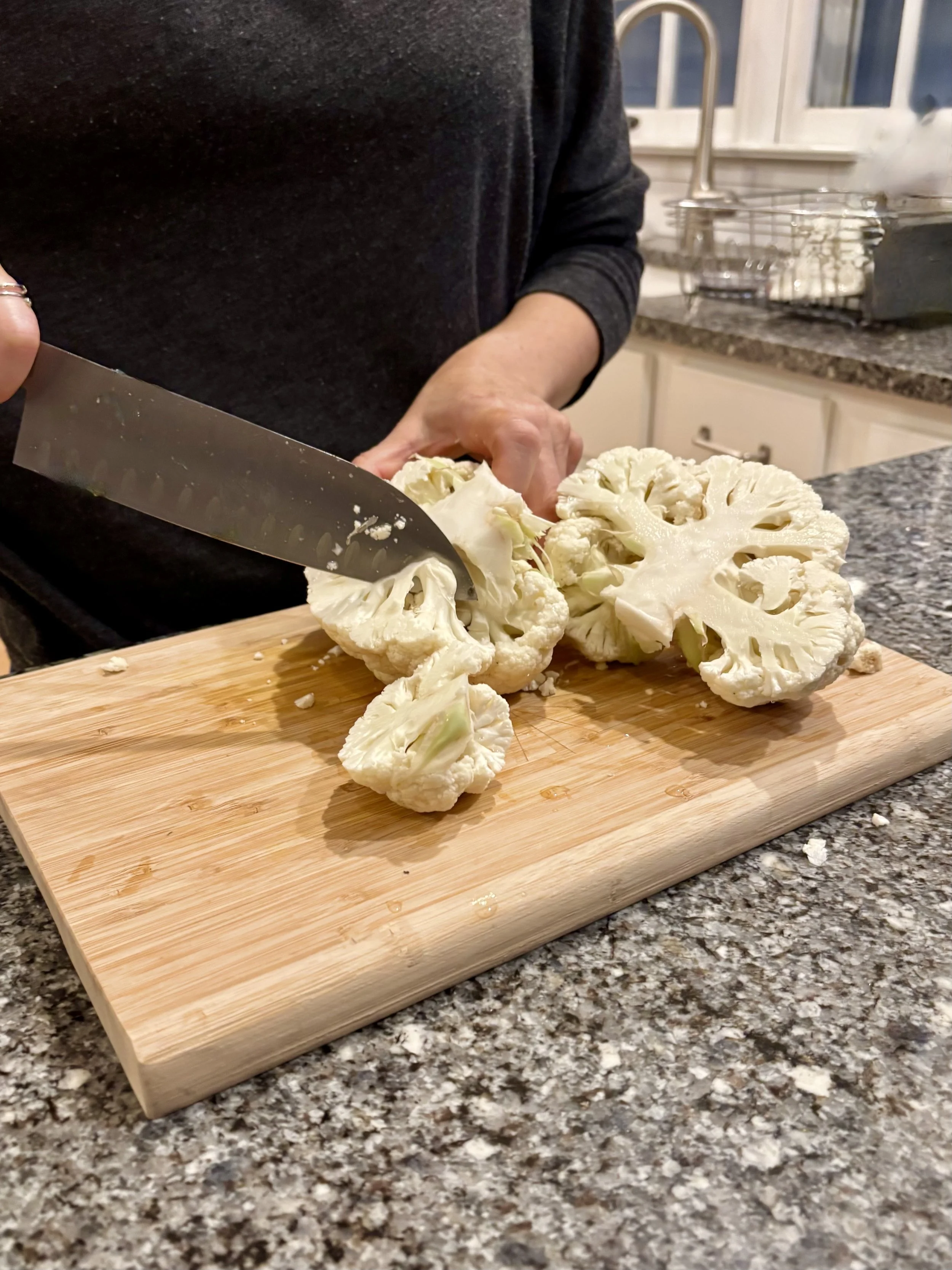 With the tip of a large knife, cut away the cauliflower florets from the core.