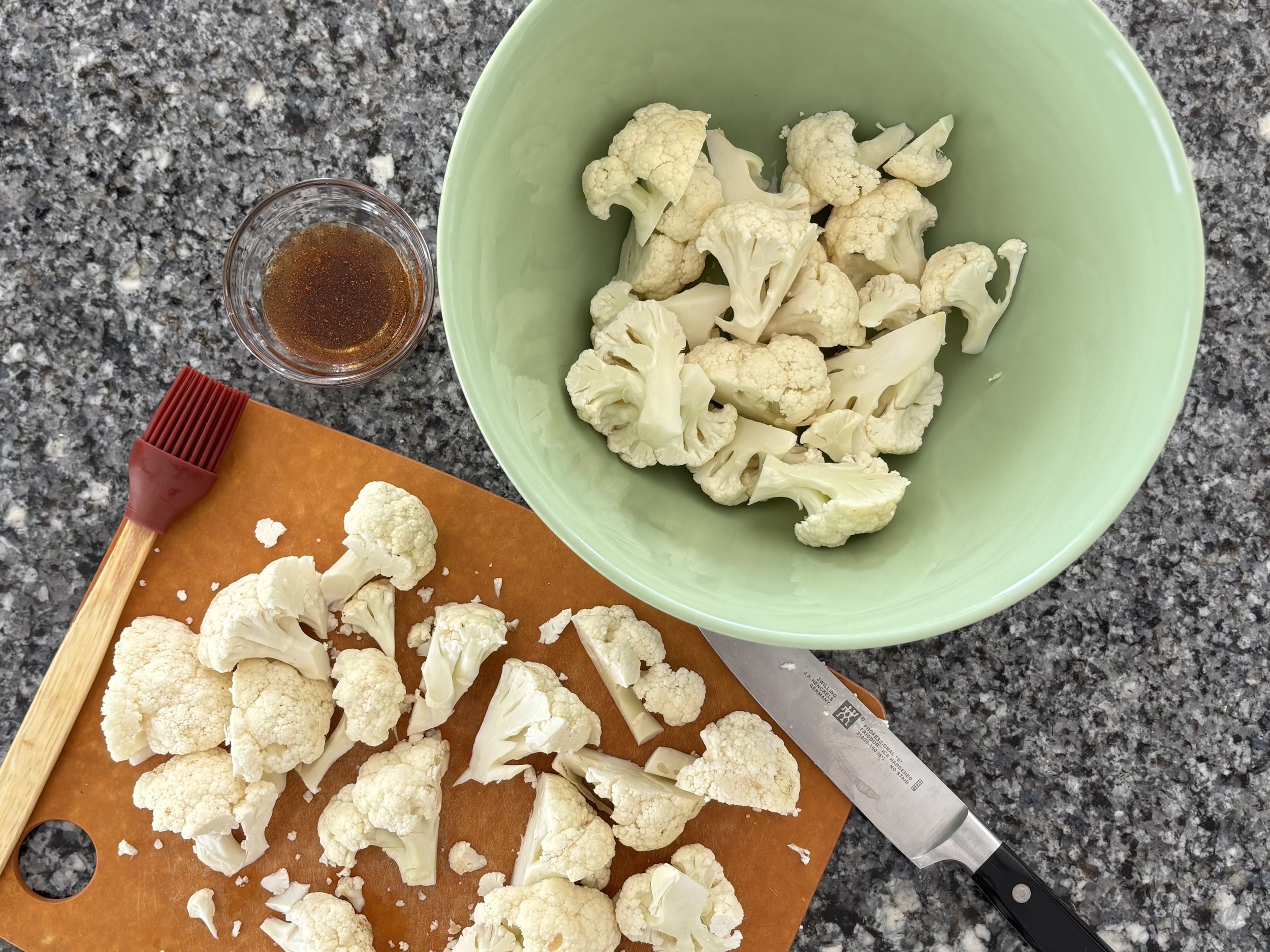 Cut florets into large bite sized pieces. Drizzle with oil and spices and mix well to assure all pieces are coated.