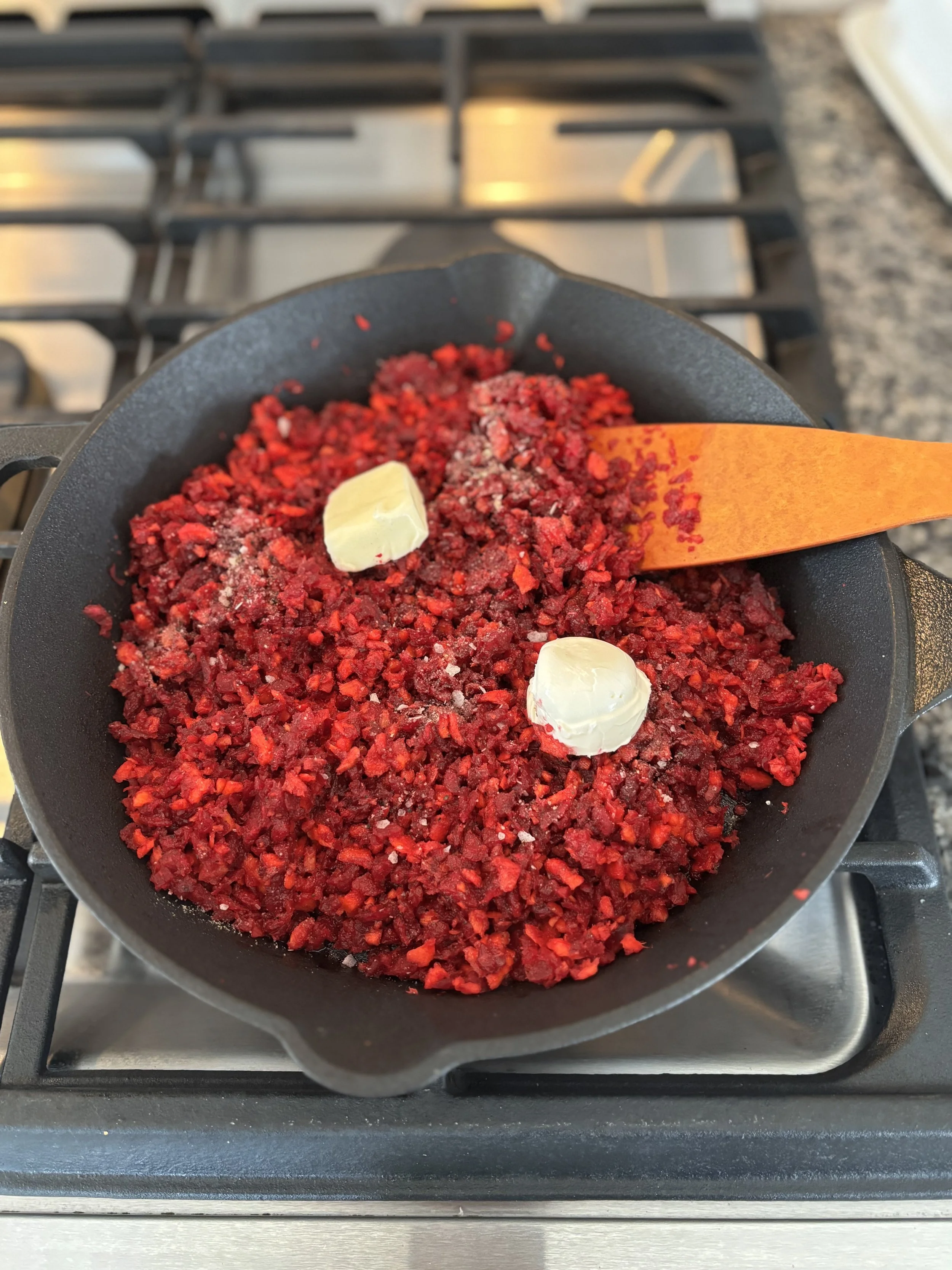 Wash, peel and cut the beets and carrots. Grind in food processor until all the big pieces are chopped. Heat oil in pan on medium heat. Add veggies, butter and spice blend. Sauté for 8-10mins. Add cream cheese during last 2 minutes and reduce heat to low. Serve and enjoy!